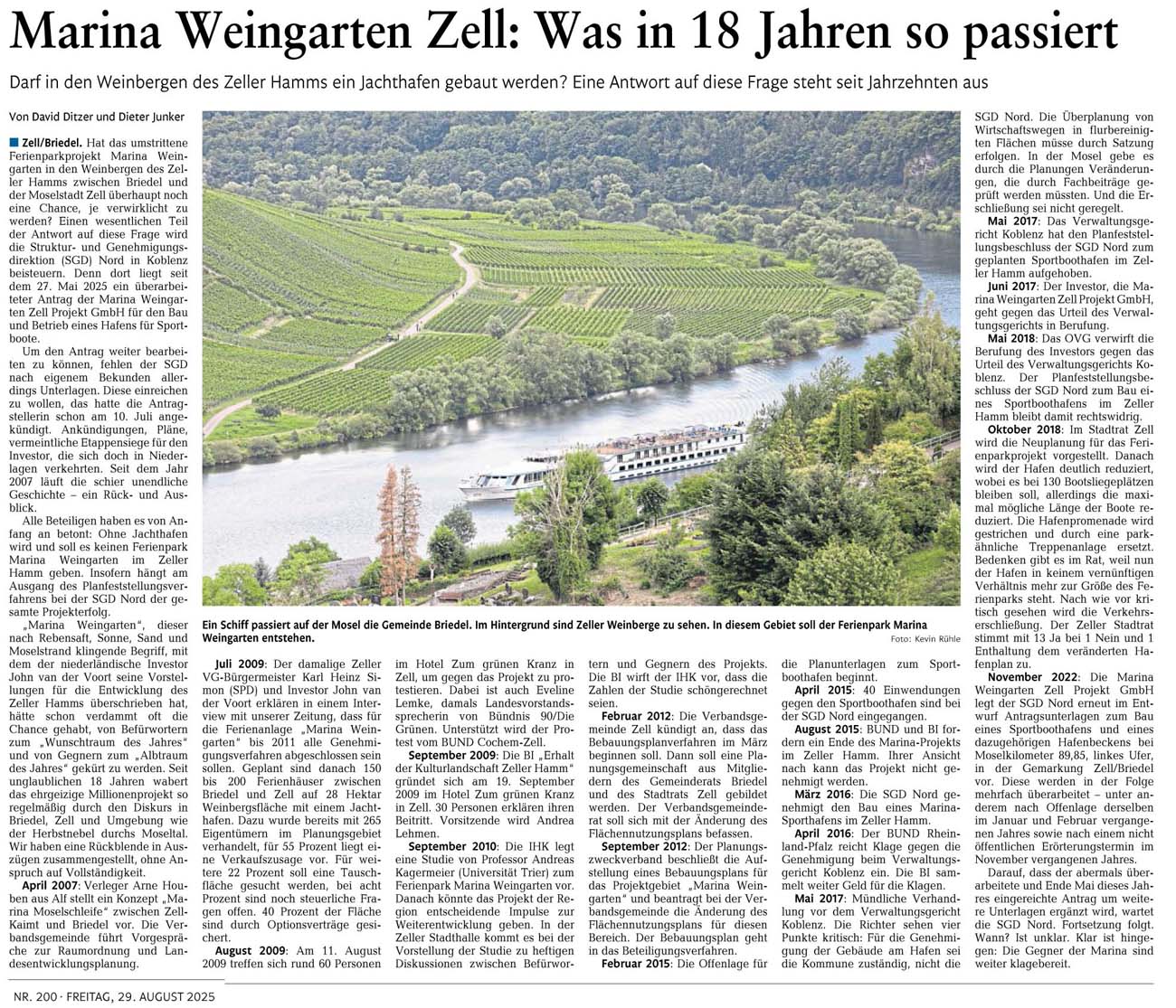 Um die in kommunaler Hand liegenden Planungsschritte für Marina Weingarten zu realisieren, hatten Briedel und Zell einen Zweckverband gegründet, in dem auch die Verbandsgemeinde Zell vertreten ist. Diesem sei der beanstandete Formfehler nicht anzulasten, sagt Helmut Halbleib von der Bauabteilung. Man habe vorab mit der SGD geklärt, welcher Teil der Planung von ihr und welcher vom Zweckverband geregelt werden könne. „Wir sind davon ausgegangen, dass der Hafen und das Umfeld komplett Sache der SGD sind, weil zum Beispiel auch der Parkplatz im Überschwemmungsgebiet der Mosel liegt.“ Die Urteile des Verwaltungsgerichtes sind noch nicht rechtskräftig. Es können Rechtsmittel dagegen eingelegt werden. Mit der SGD und Marina-Investor John van der Voort werde man sich von kommunaler Seite aus nun über das weitere Vorgehen abstimmen, so Halbleib.
